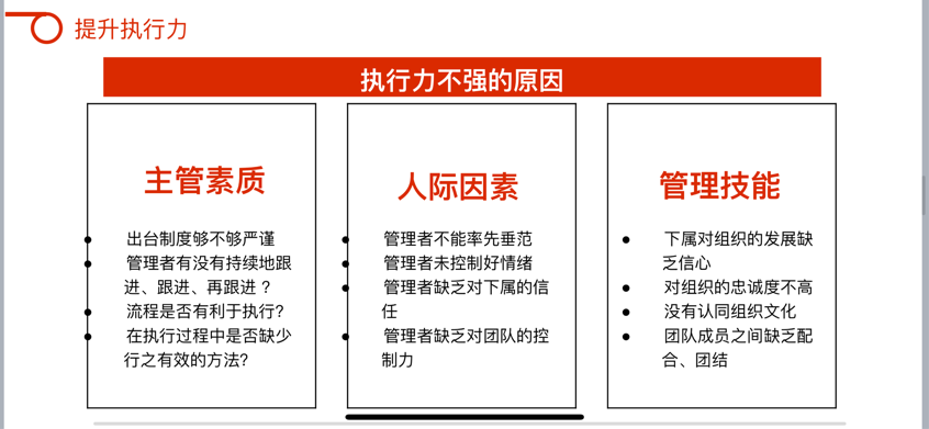 生動(dòng)形象地幫助大家建立了對(duì)執(zhí)行力的結(jié)構(gòu)化認(rèn)知,更進(jìn)一步理解到了工作態(tài)度、工作職責(zé)、工作任務(wù)、工作結(jié)果的邏輯聯(lián)系,以及如何在強(qiáng)化執(zhí)行力的同時(shí),提高部門運(yùn)作效率,使效能與效率相輔相成,創(chuàng)造出更高的部門績效。